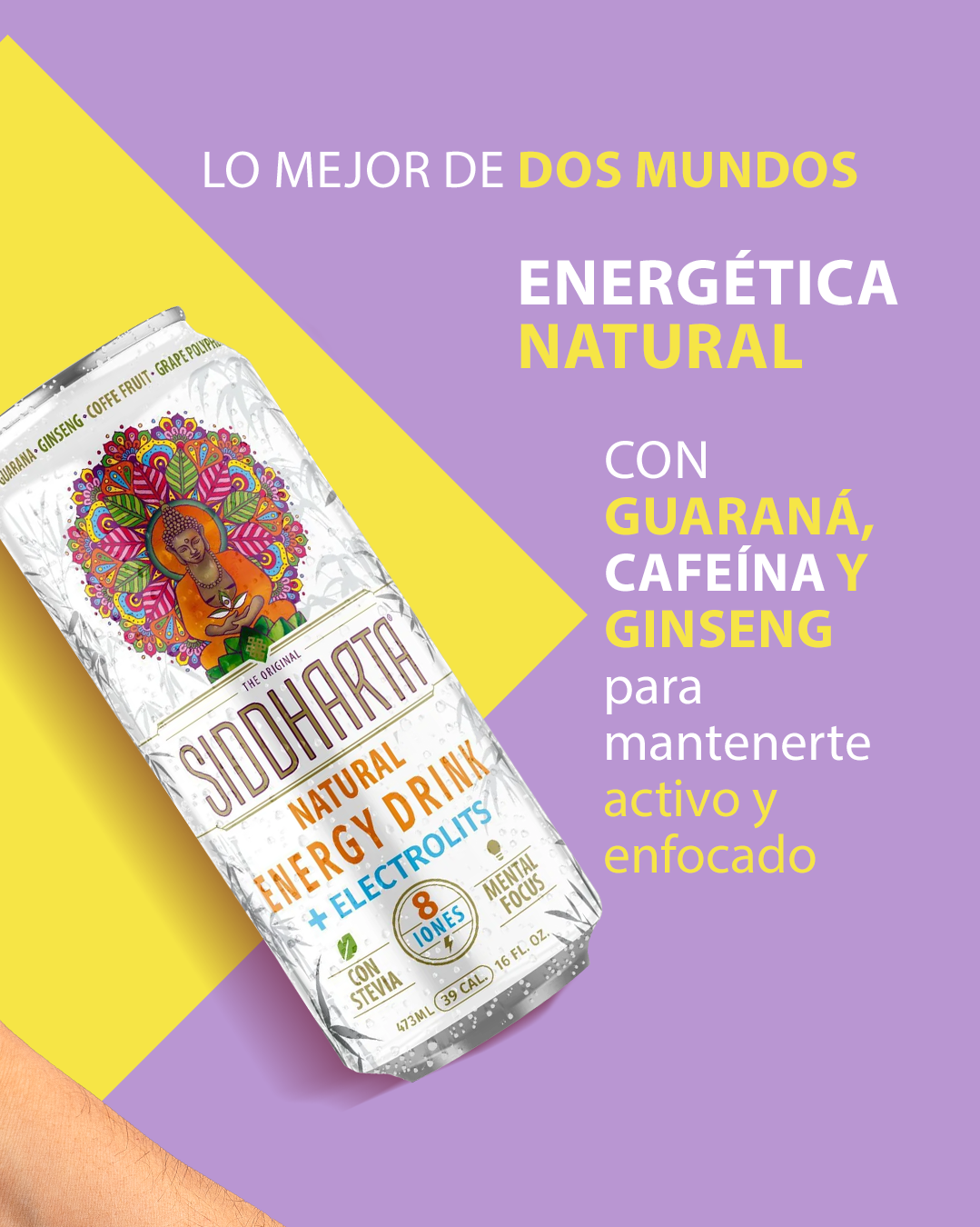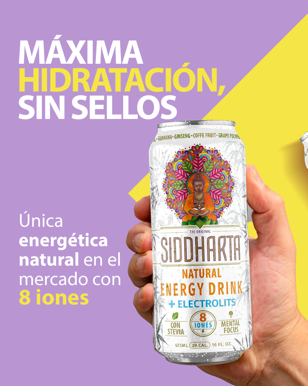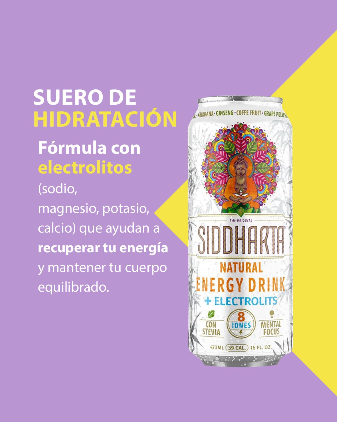 Energética + Suero de hidratación, todo en uno! Siddharta Natural Energy Drink, única energética natural en el mercado con 8 iones, endulzada con stevia y libre de sellos.